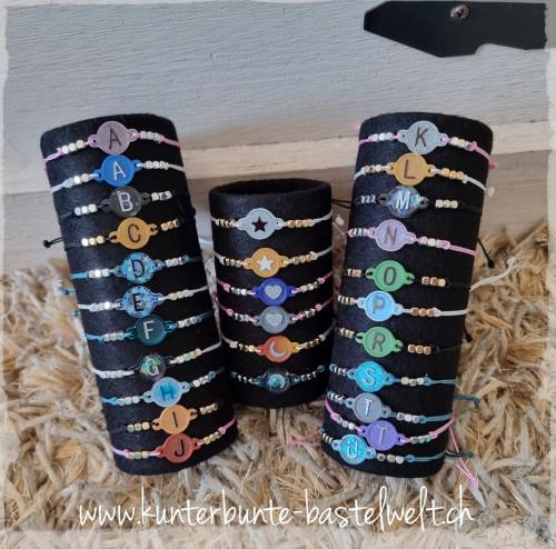 Armbänder mit einem Buchstaben aus Giessharz und verstellbarem Verschluss.